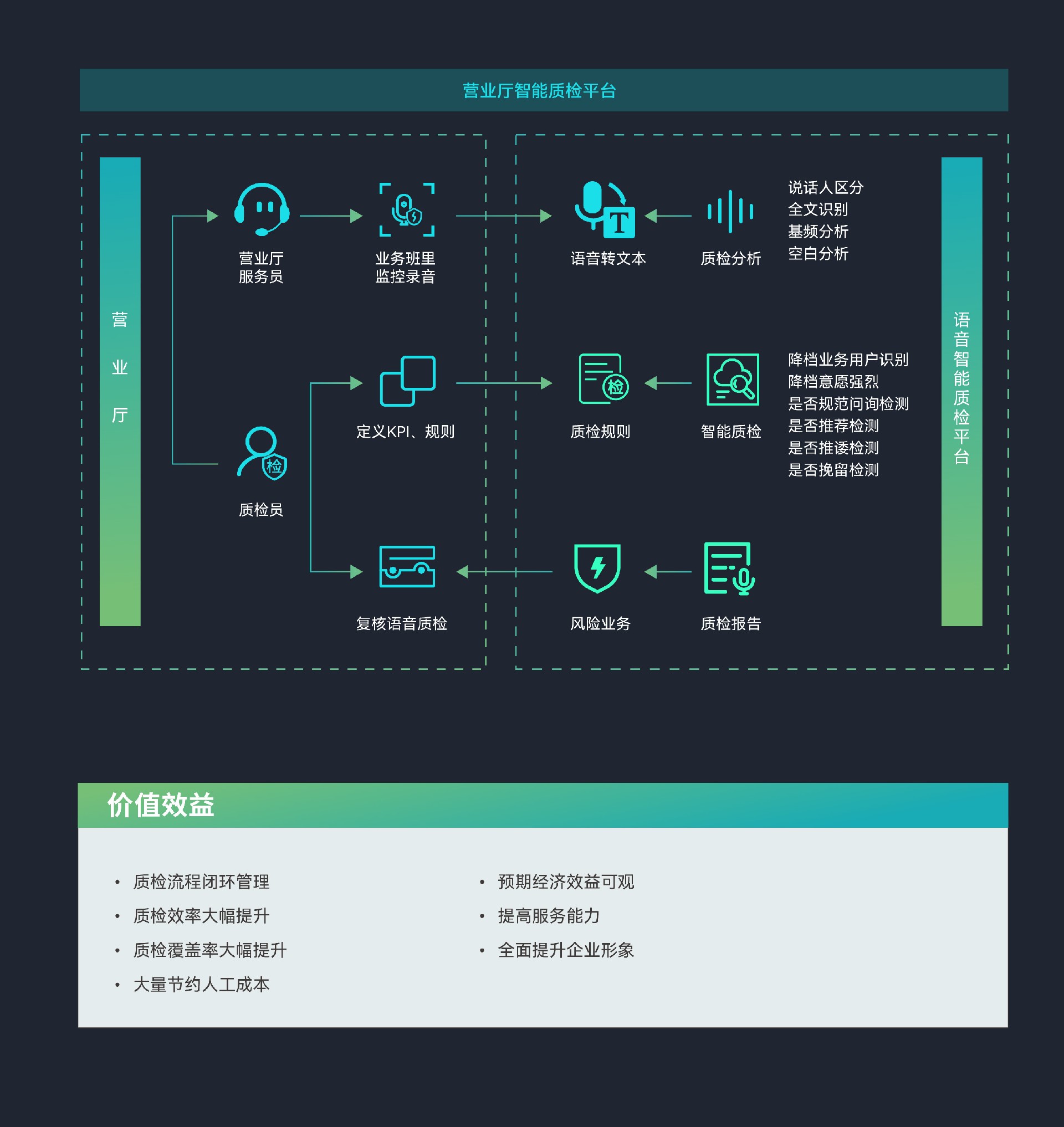 提升质检效率,优化客户体验:方案利用先进的自动化和人工智能技术,实现对营业厅服务质量的实时监控和精准分析。通过智能识别客户与营业员的对话内容,快速发现潜在问题,大大提高了质检效率。这不仅有助于企业及时发现并解决服务中的不足,还能确保客户享受到更加优质、高效的服务体验。